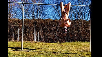 naked pathetic white slave public outdoor in penis cage do fitness and swings at his gay balls, CMNM